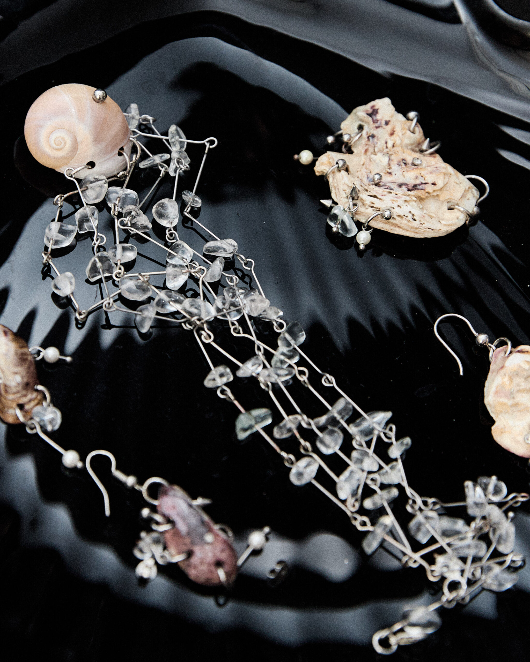Portal333 è nato in un momento di sperimentazione e curiosità creativa. Tutto è cominciato osservando e riassemblando oggetti della quotidianità: le conchiglie che mia madre ha raccolto nel corso degli anni durante sue le passeggiate in spiaggia, i piercing dell’adolescenza di mia sorella, le catene usate da mio padre nel suo laboratorio di meccanica e, naturalmente, le perle e i cristalli che da sempre fanno parte del mio linguaggio estetico. Nel 2020, in una casa traboccante di oggetti, memorie e caos creativo, è cresciuto il desiderio di dare nuova vita a materiali semplici, elevandoli a simboli sacri e potenti. Radicato nel Sud Italia, tra le onde del Mar Mediterraneo e la terra generosa della Calabria, Portal333 affonda le sue radici in una pratica intima e ancestrale: la raccolta delle conchiglie, alcune conservate in casa per anni, altre raccolte in giro per il mondo o recuperate da scarti alimentari, tutte portano con sé un’energia unica e significativa. Da queste forme imperfette nasce una collezione di gioielli non convenzionali, sospesi tra artigianato, spiritualità e ribellione. Ogni pezzo diventa un ponte tra passato e presente, tra natura e metallo, tra caos e nuovo ordine: amuleti contemporanei pensati per dare protezione, connessione e libertà, capaci di trasformarsi in compagni di vita per chi li indossa.