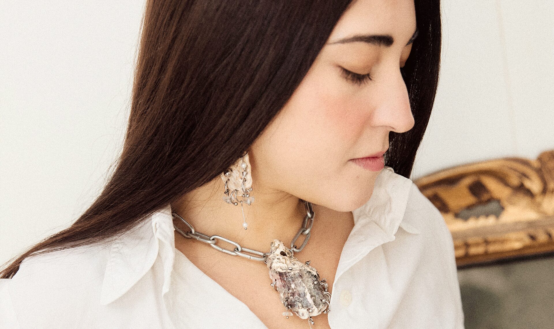 La maggior parte dei miei gioielli sono customizzati. Invito ogni persona a scegliere la propria conchiglia dal nostro archivio, che raccoglie pezzi provenienti da tutto il mondo, alcuni anche recuperati come scarti alimentari. Una volta individuata la conchiglia passo alla creazione, trasformandola in un oggetto unico che rispecchia l’energia di chi lo indosserà.